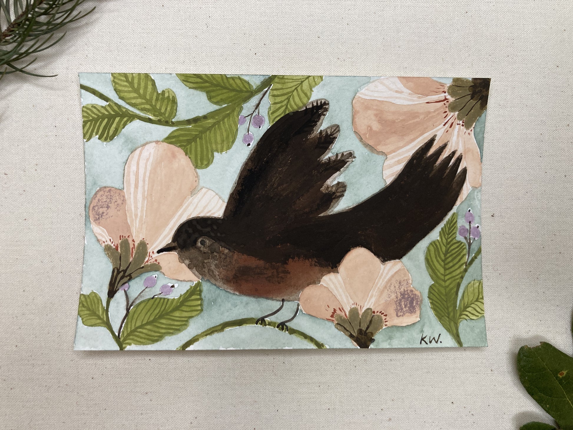 Painted on 300gsm acid free, cold pressed watercolour paper with a postcard markings on the reverse.