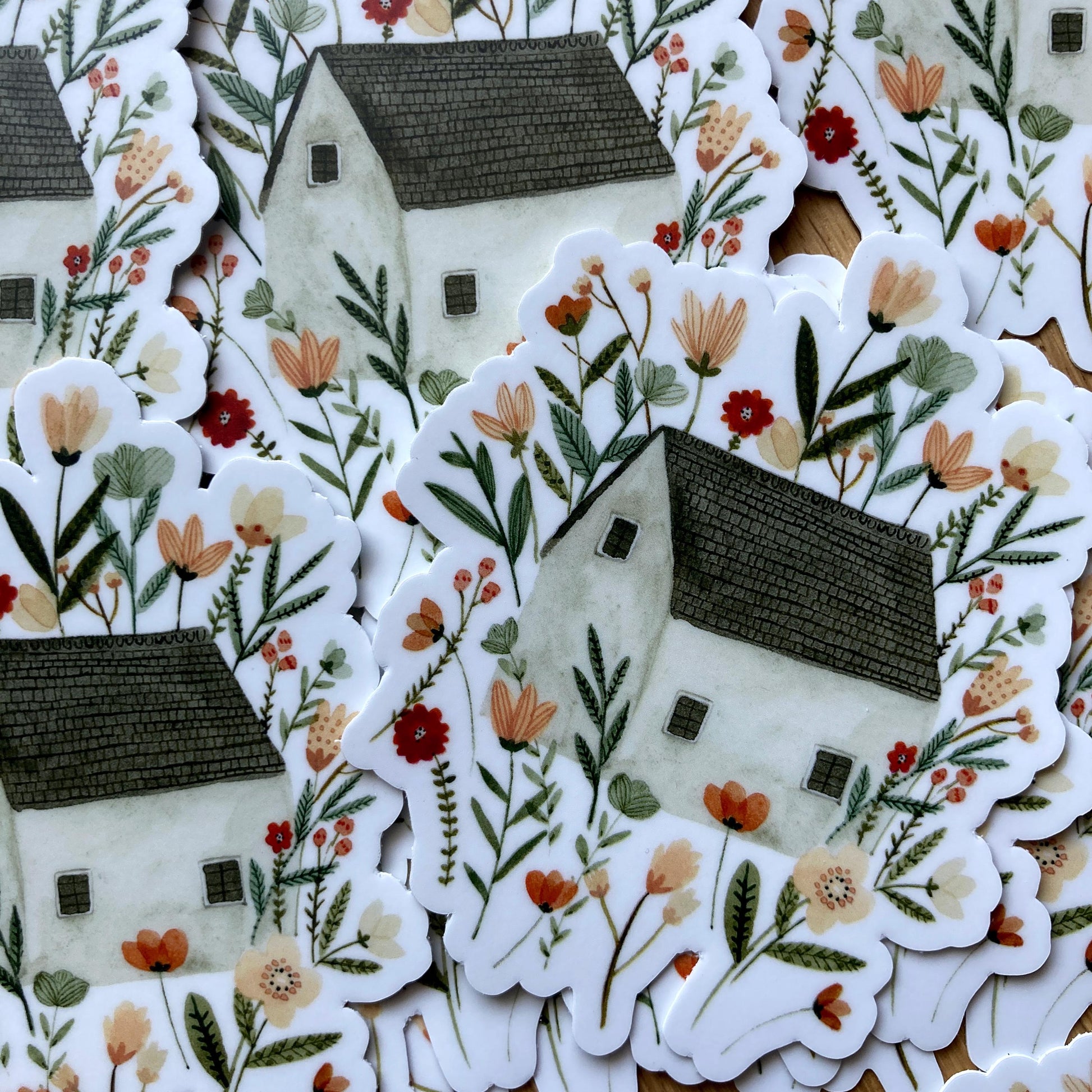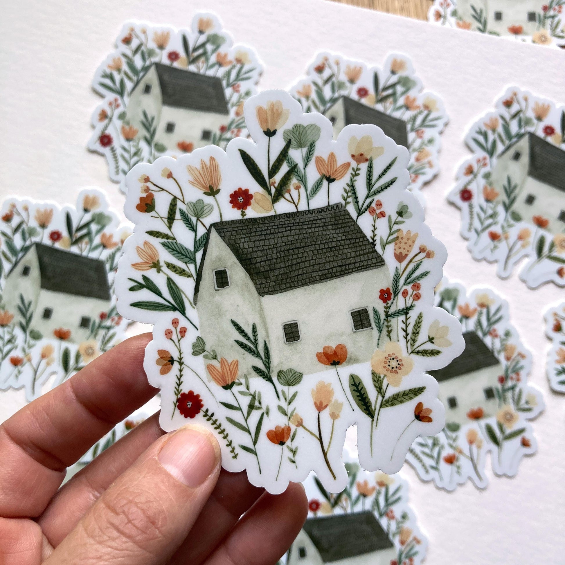 A sweet, tiny home surrounded by blooms in reds, pinks and greens.