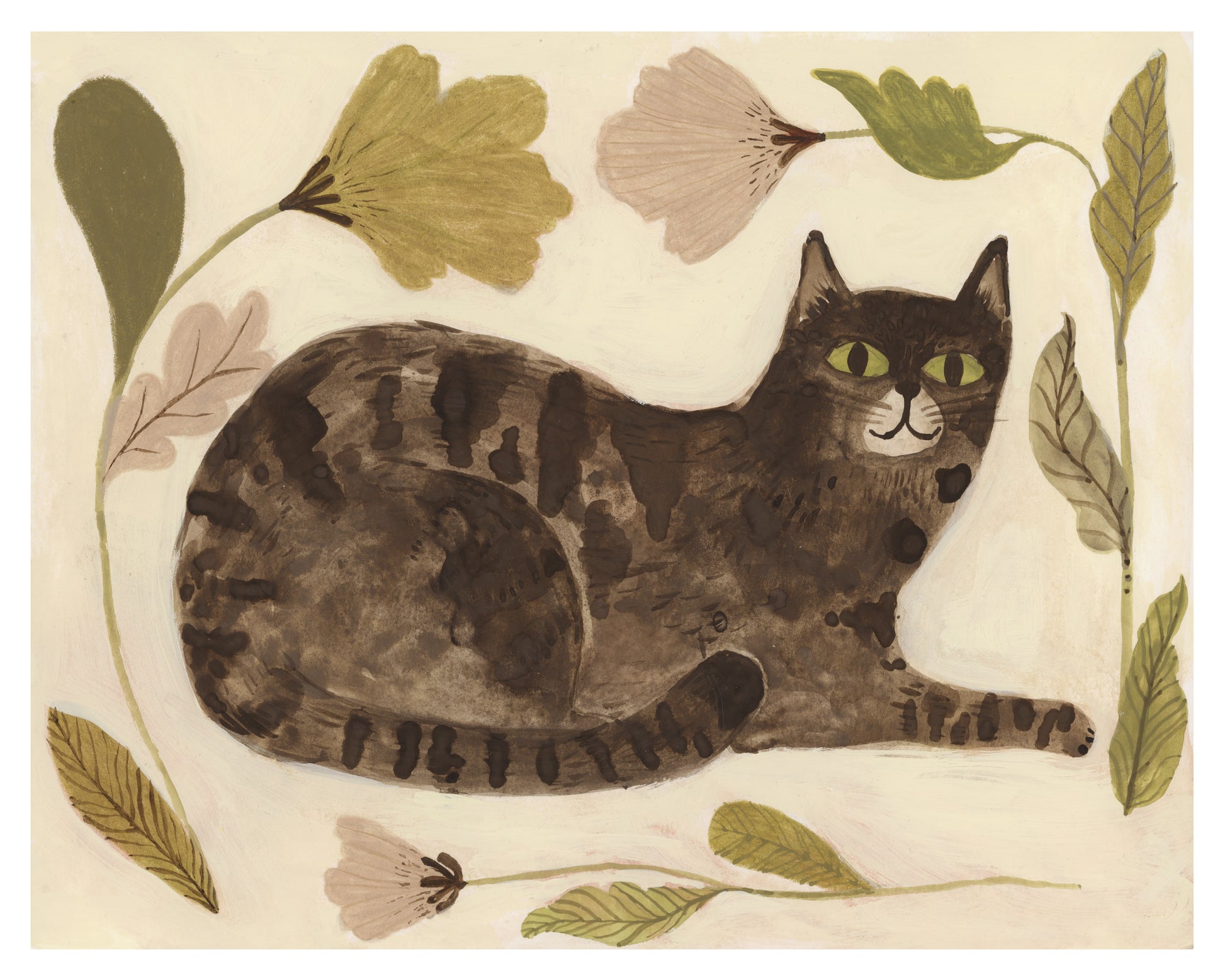 Cat with flowers art print. A gorgeous tabby cat amongst flowers and leaves in gentle soft tones. The perfect gift for cat lovers!