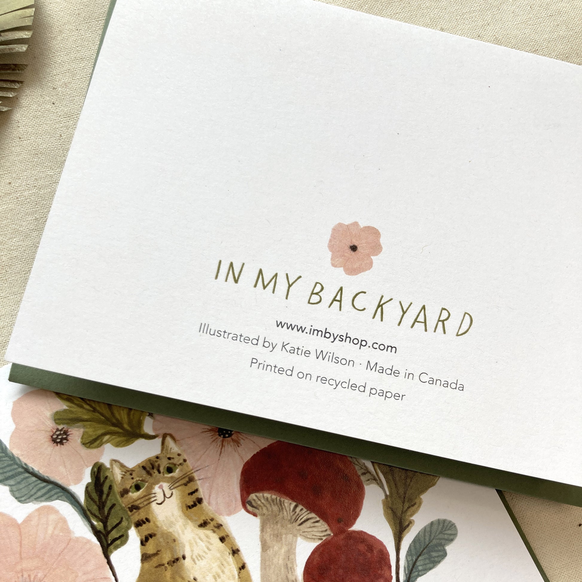 A sweet tabby cat sits in a garden of red mushrooms and pink blooms. The perfect card for sending a quick note to friends far away.