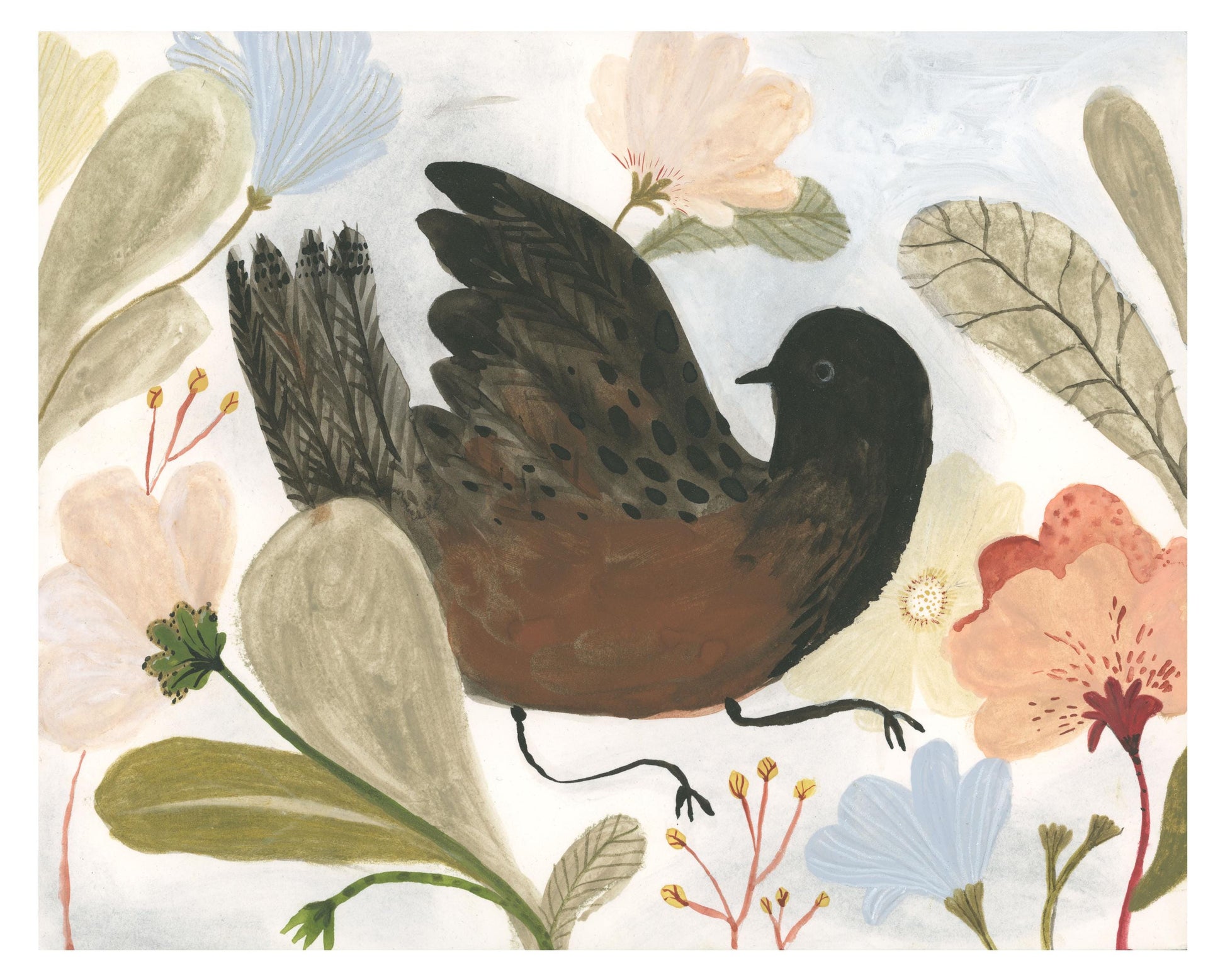 A sweet bird in a delicate floral garden.