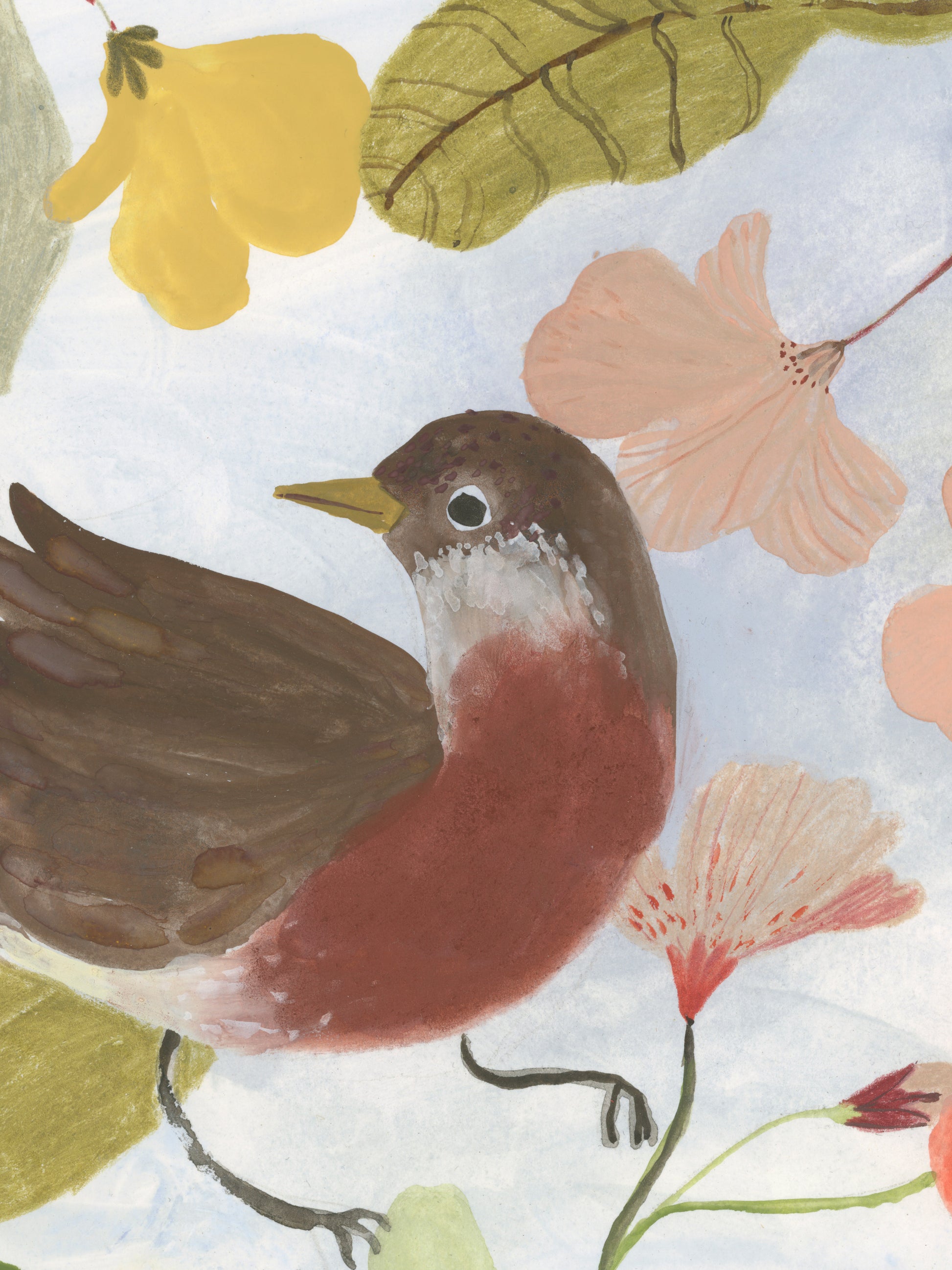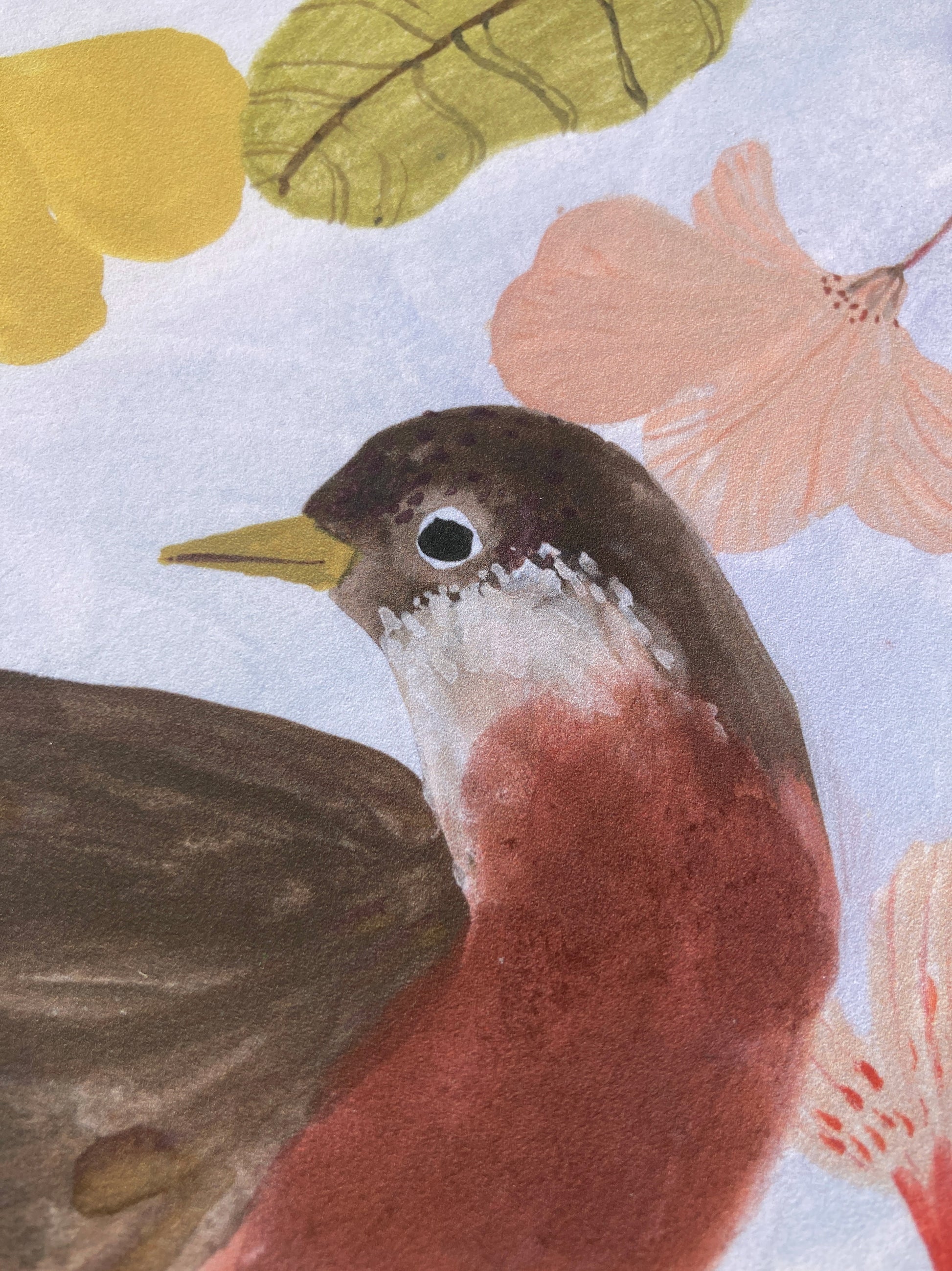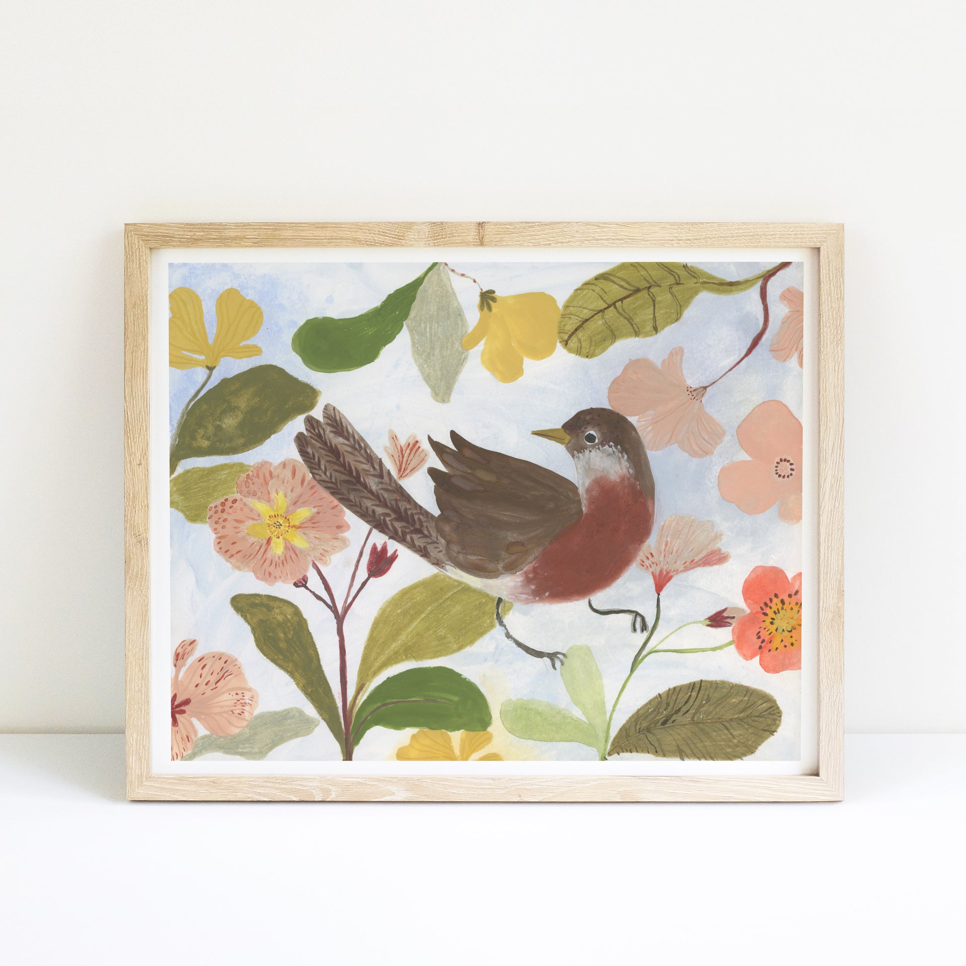 Bring the outside indoors with this colourful print of my original gouache and mixed media illustration. A red robin sits amongst greenery and flowering blooms. A reminder of nature throughout the year.