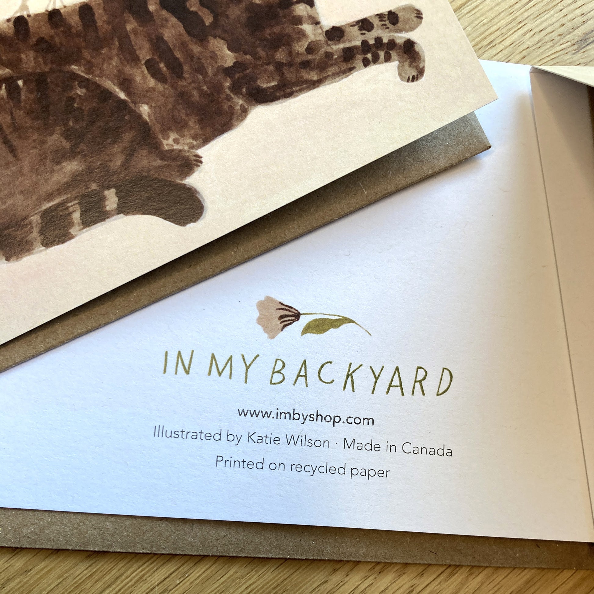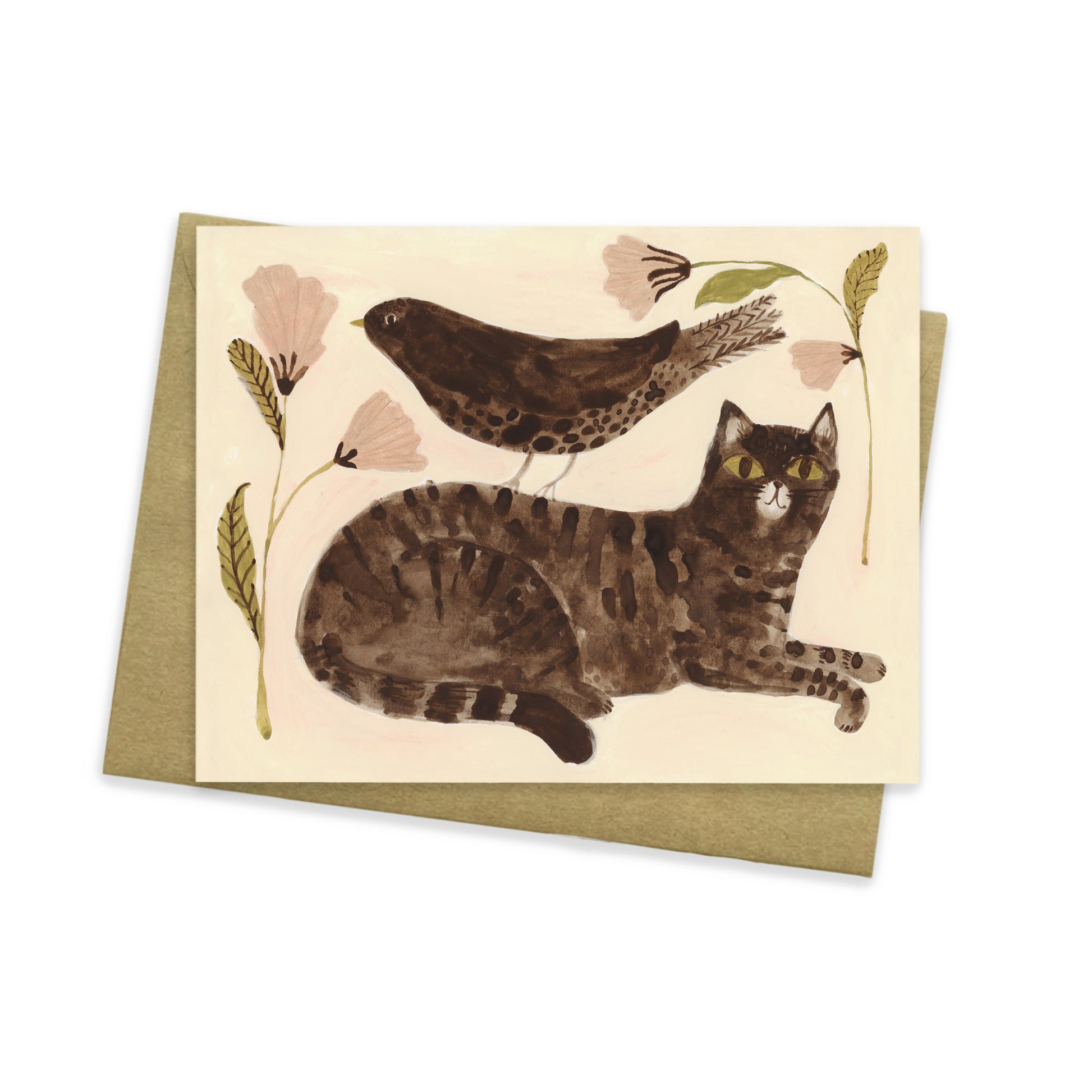 Two unlikely friends sit together in a garden. This makes a great friendship notecard for everyday sending.