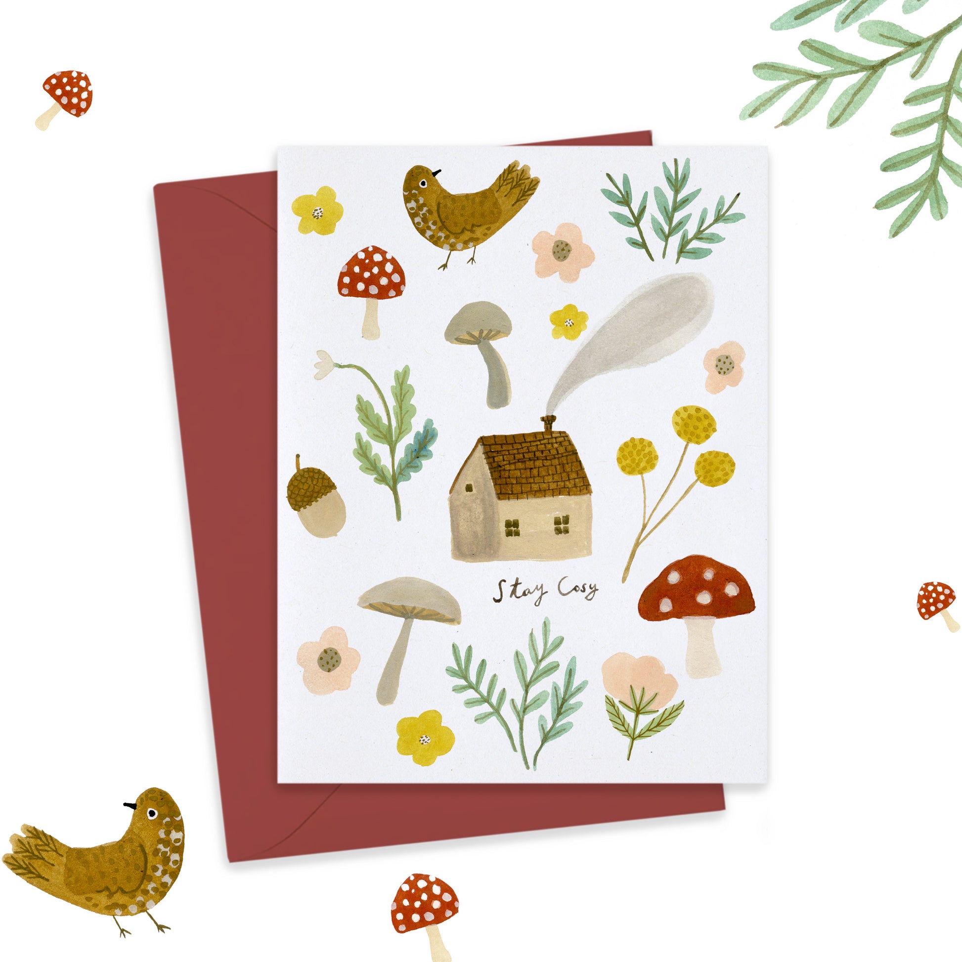 Perfect for sending a sweet note to someone far away, this card features a cosy cottage surrounded by autumnal finds.