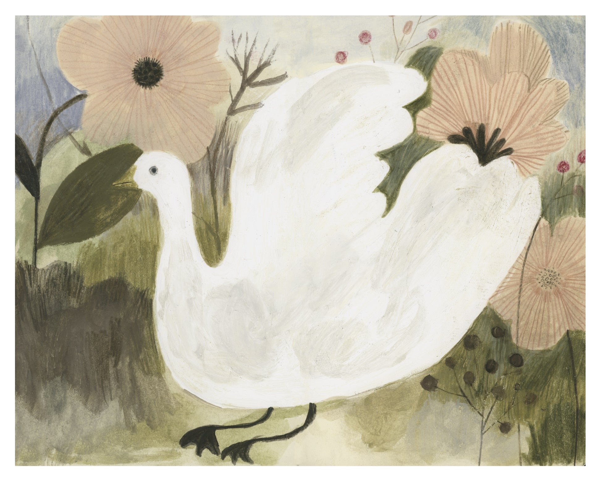 A charming goose in a textured garden filled with flowers in soft pinks.